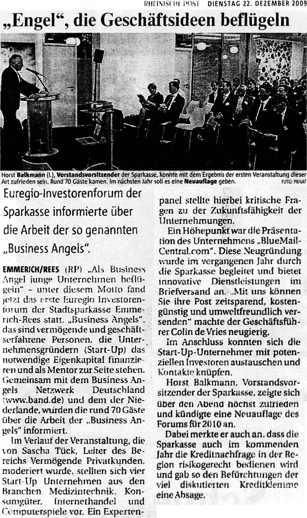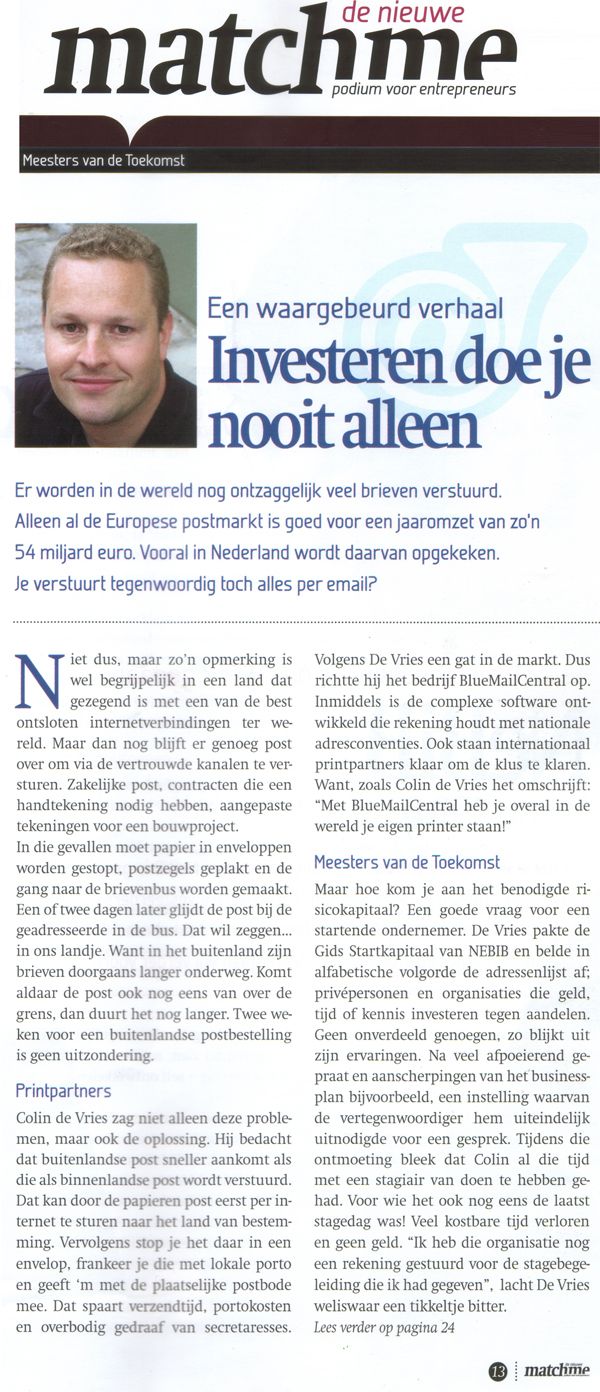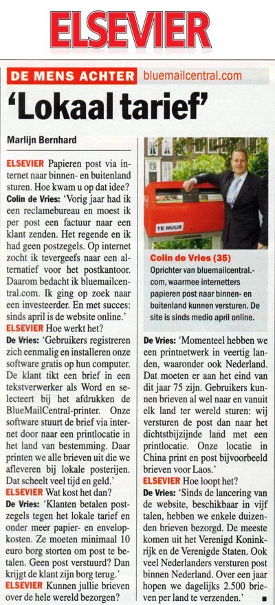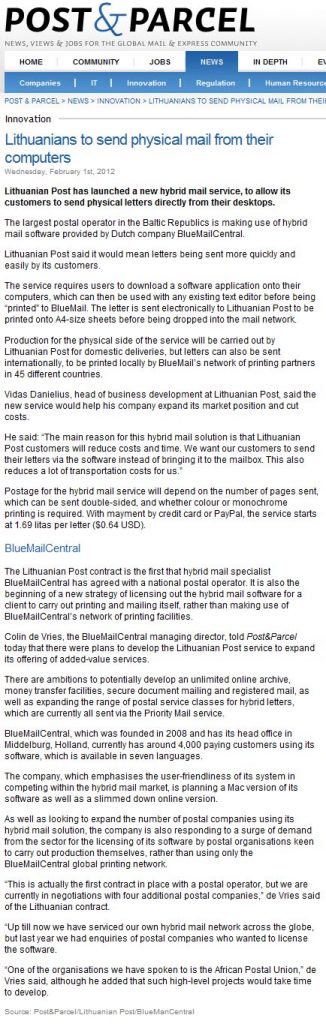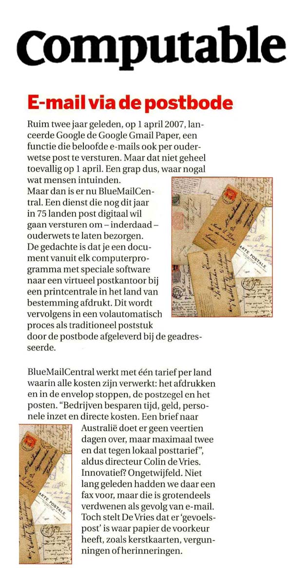 After working in companies like Microsoft, Getronics, eBay and having started and sold an advertising agency I started in the postal and telecommunications industry with a new Hybrid Mail company called BlueMailCentral. After one year of software development and building the global print network BlueMailCentral was one of the first global hybrid mail networks available for low volume customers. Thanks to the propriety software available in 8 different languages and supporting all currencies in the world the company offered a local look and feel. BlueMailCentral was sold to Digital2Print USA who in their turn sold it to the Australian company Solutiondynamics. BlueMailCentral had huge amounts of press. Below is a selection from those press articles.
